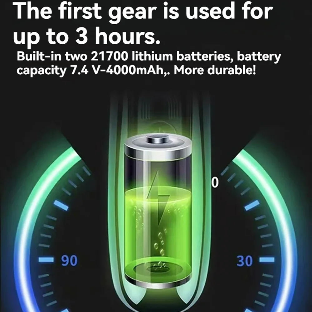 🔋 Long Lasting Power Supply: Equipped with dual polymer batteries totaling 3000mAh capacity, enjoy up to 4 hours of operation on the 1st gear with fast charging support via Type C interface.